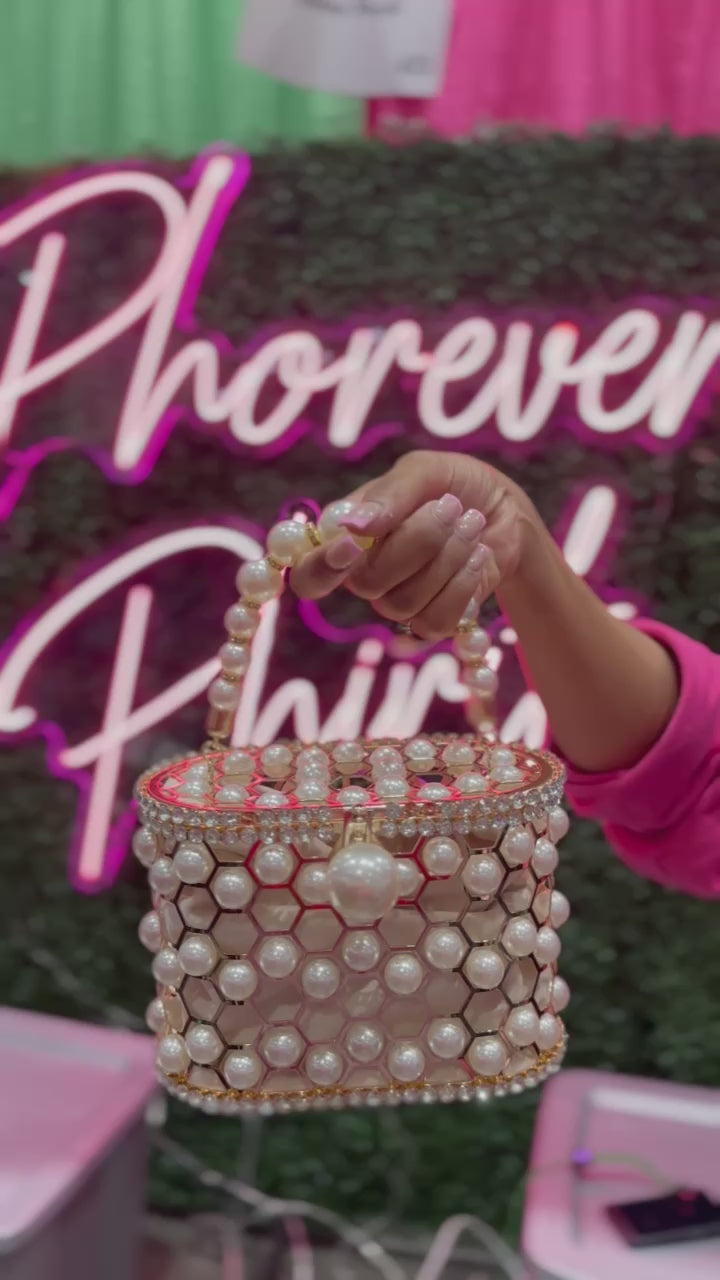 Pearl caged construction with pearl, gold metal trim. This piece is lined with fabric and topped with a fixed faux pearl handle.